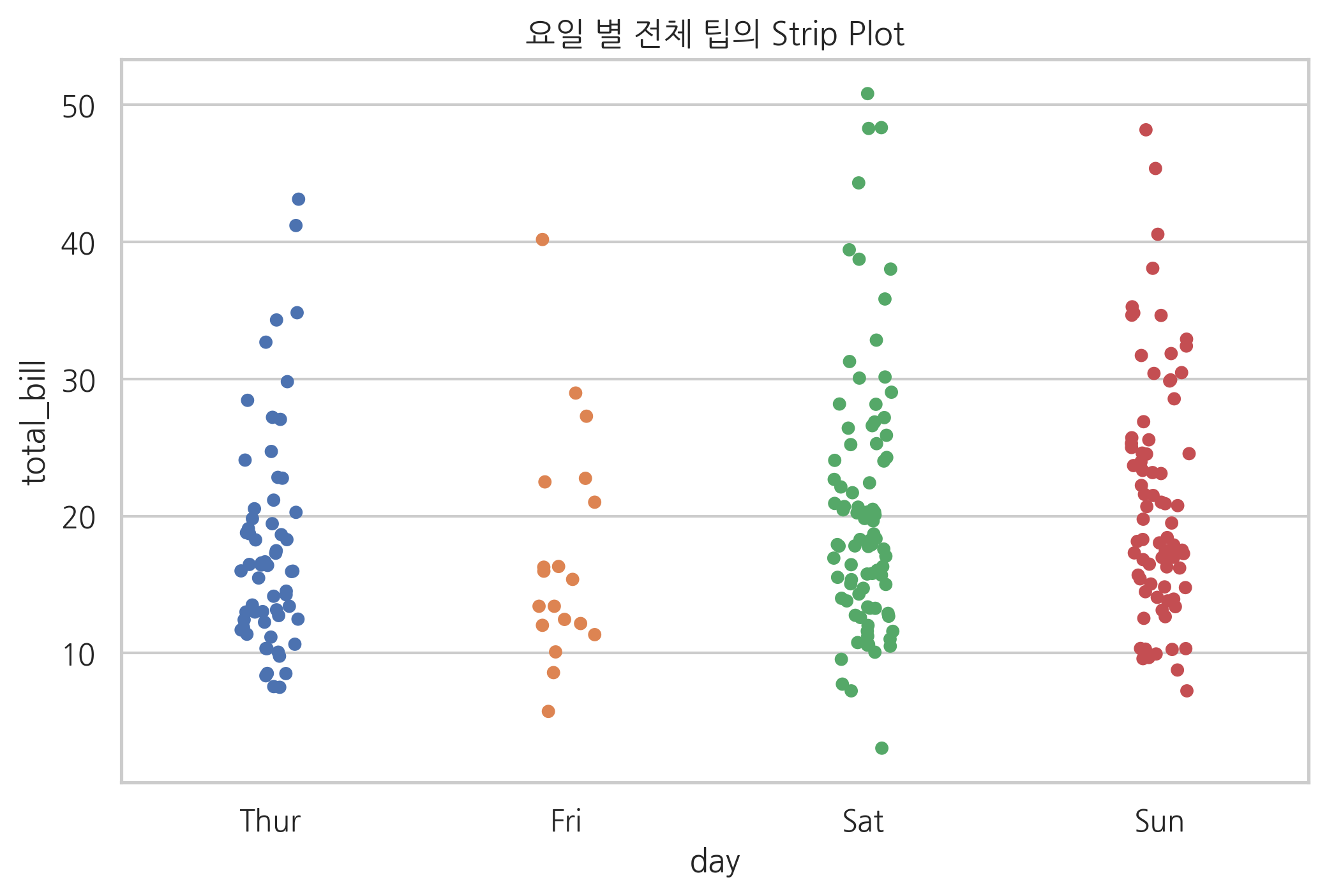 plt.title("요일 별 전체 팁의 Strip Plot")
