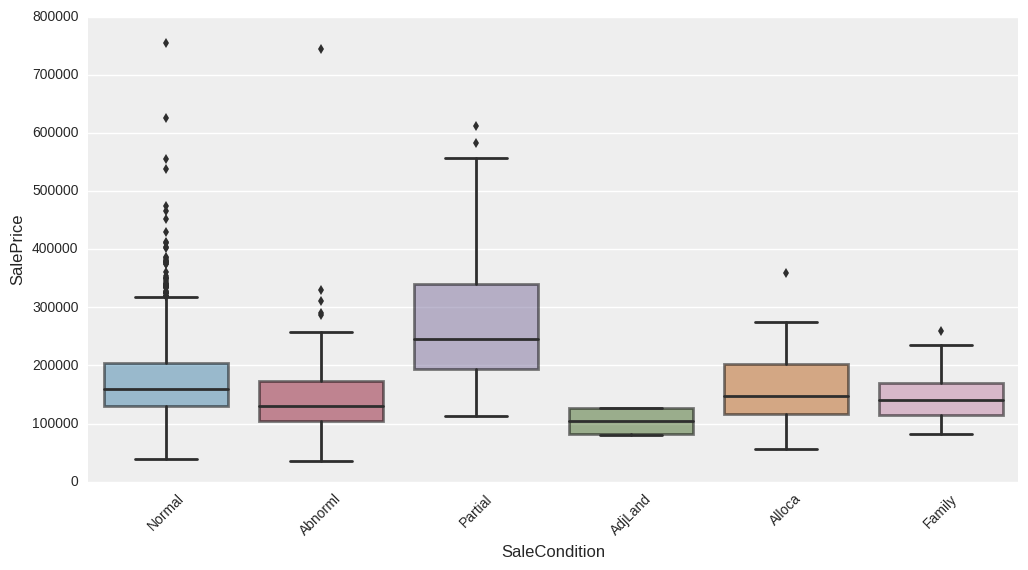 ax = sns.boxplot(x='SaleCondition', y='SalePrice', data=df_categ)