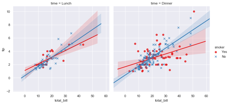 - lmplot은 'hue=칼럼'으로 색을 구분지을 수 있고 , marker=["o","x"] 로 표시방법도 구분할 수 있다.