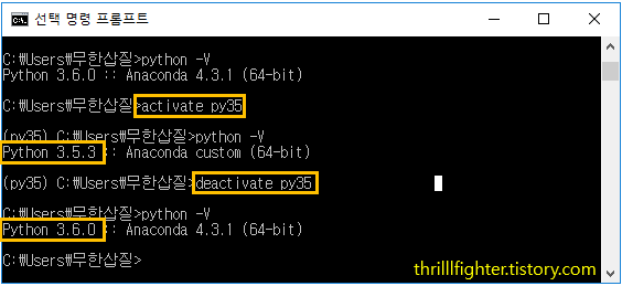 반대로 deactivate py35를 하면 기본 환경으로 빠져 나오므로