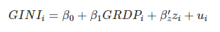 는 다른 설명변수 벡터를 말한다. 소득이 불평등에 미치는 효과를 추정하기 위해 선형식을 세운다고 해보자. 그리고 관심의 대상을 구체적으로 지역단위로 좁혀보자.
