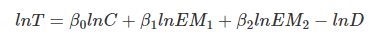 여기서 이면 1차동차함수인데, 각각의 값을 추정하기 위해 양변에 로그를 취해서 가설검정을 하고는 한다. 이 경우 로그를 취하지 않으면 추정이 매우, 매우 어려워 질 수 밖에 없다.