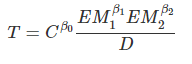 T는 교역량, EM은 경제적 질량을 말한다. 국가의 경제규모가 커질수록 교역량이 늘어나고, 국가 간의 거리가 너무 멀다면 비용문제로 교역량은 줄어들테니, 상식적으로 말은 된다.